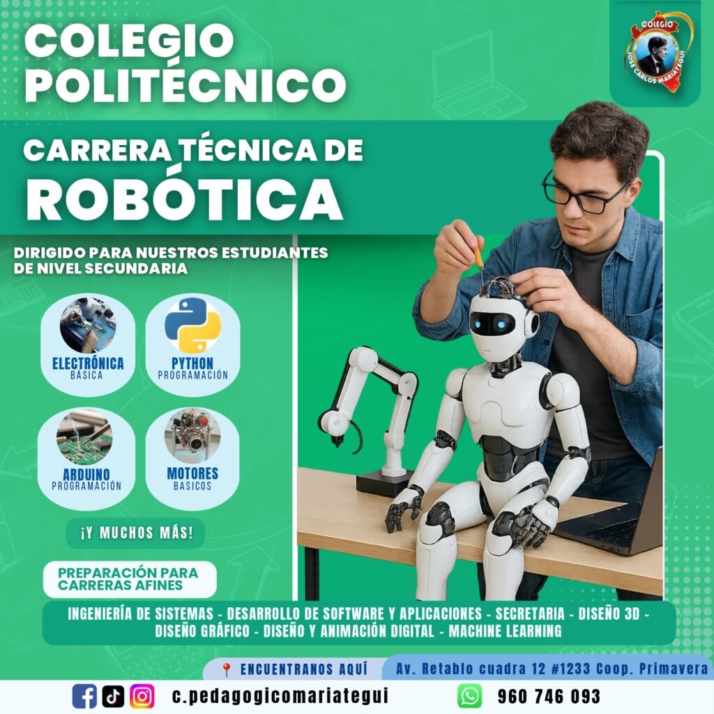 No se preocupe. En Mariátegui, su hijo no solo estudia; se prepara para ganar. Le damos una base de conocimiento muy fuerte con clases técnicas prácticas (Enfermería, Robótica o Mecánica). Además, tiene una computadora solo para él en el aula, asegurando que aprenda las habilidades digitales que sí o sí necesitará para tener éxito.